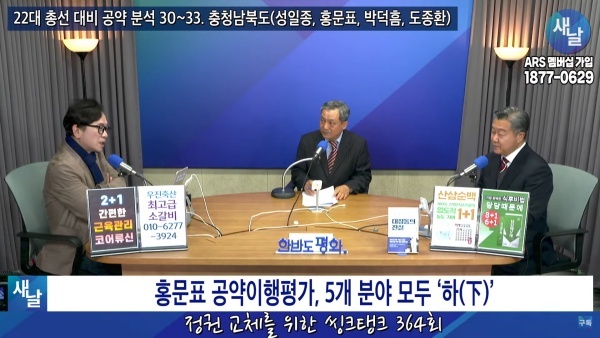 2024년01월09일(화요일) 새날 유튜브 방송은 2020년 21대 국회의원 선거에서 당선된 충청남도 홍성군·예산군 홍문표 의원이 제시한 선거공약을 평가했다. 평가를 위한 방송에는 푸른나무, 이상구 원장, 민진규 소장(국가정보전략연구소)이 출연했다.