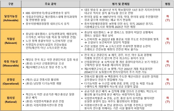 ▲ 충청남도 홍성군·예산군 홍문표 의원 공약 평가 결과(달성가능성/적절성/측정가능성/운영성/합리성) [출처=국가정보전략연구소(iNIS)]