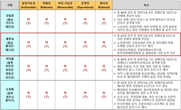 홍영표 의원이 제시한 43개 공약은 서산시·태안군 성일종 의원과 마찬가지로 △달성가능성 △적절성 △측정가능성 △운영성 △합리성 등 5개 영역 모두에서 최하인 하(下) 평점을 받았다.