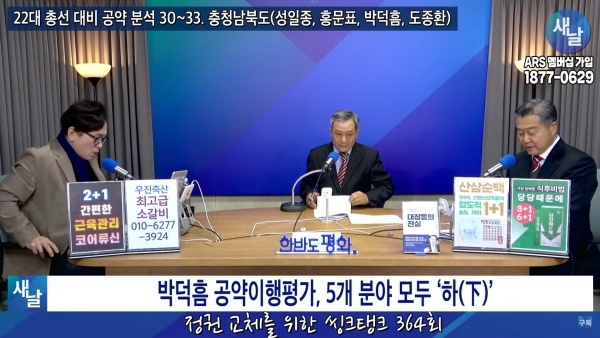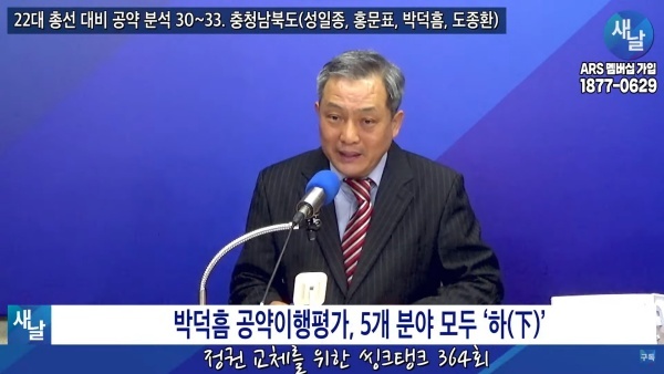 2024년01월09일(화요일) 새날 유튜브 방송은 2020년 21대 국회의원 선거에서 당선된 충청북도 보은군·옥천군·영동군·괴산군 박덕흠 의원이 제시한 선거공약을 평가했다. 평가를 위한 방송에는 푸른나무, 이상구 원장, 민진규 소장(국가정보전략연구소)이 출연했다.