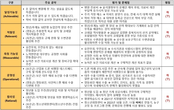 ▲ 충청북도 보은군·옥천군·영동군·괴산군 박덕흠 의원 공약 평가 결과(달성가능성/적절성/측정가능성/운영성/합리성) [출처=국가정보전략연구소(iNIS)]