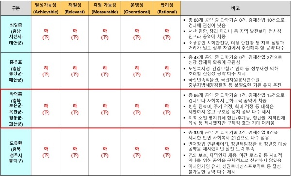 박덕흠 의원이 제시한 86개 공약은 서산시·태안군 성일종 의원, 홍성군·예산군 홍문표 의원과 마찬가지로 △달성가능성 △적절성 △측정가능성 △운영성 △합리성 등 5개 영역 모두에서 최하인 하(下) 평점을 받았다.