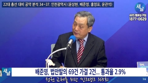 2024년01월16일(화요일) 새날 유튜브 방송은 2020년 21대 국회의원 선거에서 당선된 인천광역시 중구·강화군·옹진군 배준영 의원이 제시한 선거공약을 평가했다. 평가를 위한 방송에는 푸른나무, 이상구 원장, 민진규 소장(국가정보전략연구소)이 출연했다.