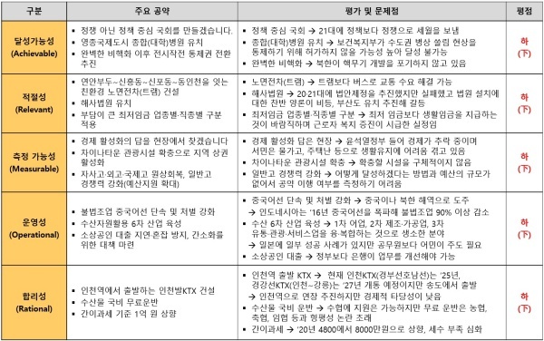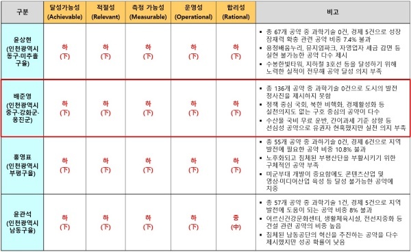 배 의원이 제시한 136개 공약은 인천광역시 동구·미추홀구을 윤상현 의원과 마찬가지로 △달성가능성 △적절성 △측정가능성 △운영성 △합리성 등 5개 영역 모두에서 최하인 하(下) 평점을 받았다.