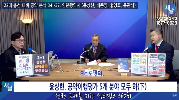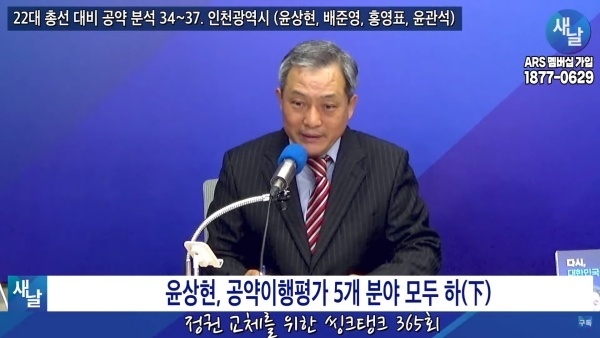 2024년01월16일(화요일) 새날 유튜브 방송은 2020년 21대 국회의원 선거에서 당선된 인천광역시 동구·미추홀구을 윤상현 의원이 제시한 선거공약을 평가했다. 평가를 위한 방송에는 푸른나무, 이상구 원장, 민진규 소장(국가정보전략연구소)이 출연했다.