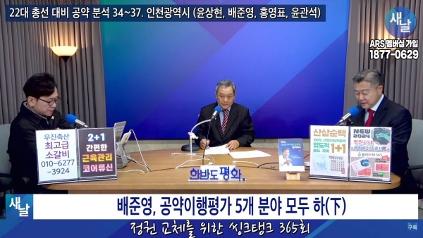 2024년01월16일(화요일) 새날 유튜브 방송은 2020년 21대 국회의원 선거에서 당선된 인천광역시 중구·강화군·옹진군 배준영 의원이 제시한 선거공약을 평가했다. 평가를 위한 방송에는 푸른나무, 이상구 원장, 민진규 소장(국가정보전략연구소)이 출연했다.