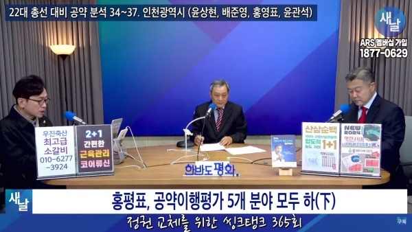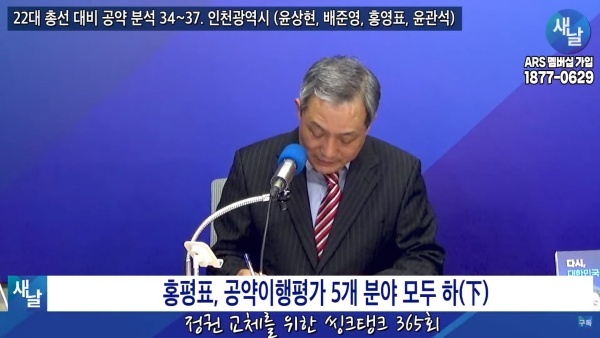 2024년01월16일(화요일) 새날 유튜브 방송은 2020년 21대 국회의원 선거에서 당선된 인천광역시 부평구을 홍영표 의원이 제시한 선거공약을 평가했다. 평가를 위한 방송에는 푸른나무, 이상구 원장, 민진규 소장(국가정보전략연구소)이 출연했다.