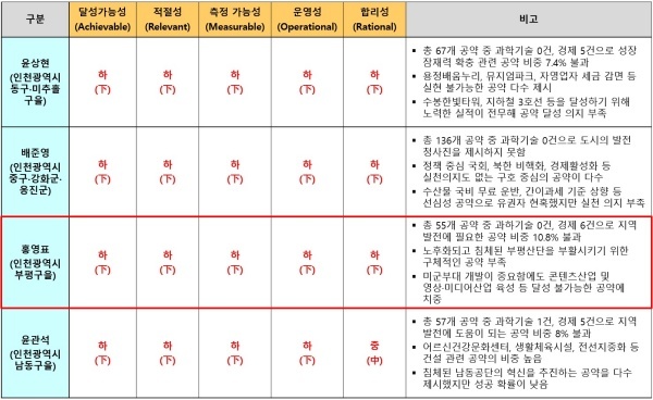 홍 의원이 제시한 55개 공약은 인천광역시 동구·미추홀구을 윤상현 의원, 중구·강화군·옹진군 배준영 의원과 마찬가지로 △달성가능성 △적절성 △측정가능성 △운영성 △합리성 등 5개 영역 모두에서 최하인 하(下) 평점을 받았다.