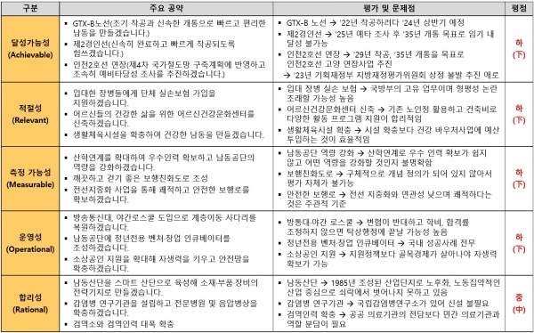 ▲ 인천광역시 남동구을 윤관석 의원 공약 평가 결과(달성가능성/적절성/측정가능성/운영성/합리성) [출처=국가정보전략연구소(iNIS)]