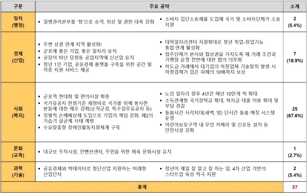 다음으로 △경제(산업) 공약 18.9% △정치(행정) 공약 5.4% △과학(기술) 공약 5.4% △문화(교육) 공약 2.7%를 각각 기록했다.
