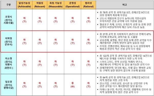 이 의원이 제시한 37개 공약은 경기도 시흥시을 조정식 의원과 마찬가지로 달성가능성 △적절성 △측정가능성 △운영성 △합리성 등 5개 영역 최하인 하(下) 평점을 받았다.