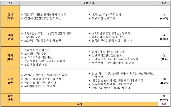 다음으로 △문화교육 공약 28.0% △경제산업 공약 6.0% △정치행정 공약 4.0% △과학기술 공약 0.0%를 각각 기록했다.