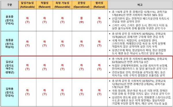 김 의원이 제시한 175개 공약은 △달성가능성 △적절성 △측정가능성 △운영성 △합리성 등 5개 영역 모두 최하인 하(下) 평점을 받았다.