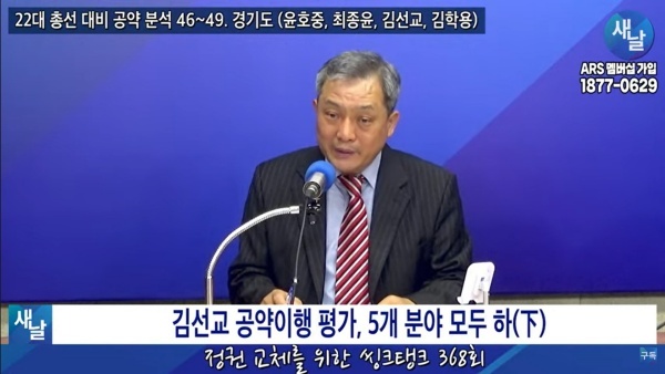 2024년02월06일(화요일) 새날 유튜브 방송은 2020년 21대 국회의원 선거에서 당선된 경기도 여주시·양평군 김선교 의원이 제시한 선거공약을 평가했다. 평가를 위한 방송에는 푸른나무, 이상구 원장, 민진규 소장(국가정보전략연구소)이 출연했다.