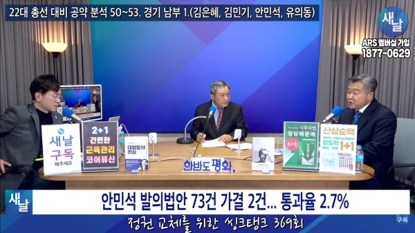 2024년02월13일(화요일) 새날 유튜브 방송은 2020년 21대 국회의원 선거에서 당선된 경기도 오산시 안민석 의원이 제시한 선거공약을 평가했다. 평가를 위한 방송에는 푸른나무, 이상구 원장, 민진규 소장(국가정보전략연구소)이 출연했다.