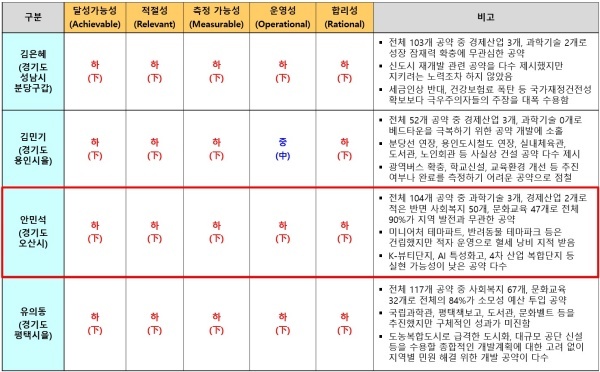 ▲ 경기도 오산시 안민석 의원 공약 평가 결과(달성가능성/적절성/측정가능성/운영성/합리성) [출처=국가정보전략연구소(iNIS)]