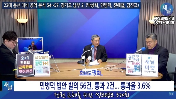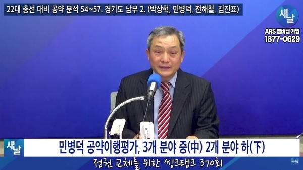 2024년02월20일(화요일) 새날 유튜브 방송은 2020년 21대 국회의원 선거에서 당선된 경기도 안양시 동안구갑 민병덕 의원이 제시한 선거공약을 평가했다. 평가를 위한 방송에는 푸른나무, 이상구 원장, 민진규 소장(국가정보전략연구소)이 출연했다.