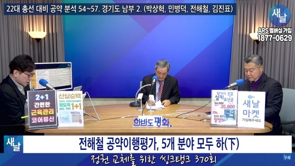 2024년02월20일(화요일) 새날 유튜브 방송은 2020년 21대 국회의원 선거에서 당선된 경기도 안산시 상록구갑 전해철 의원이 제시한 선거공약을 평가했다. 평가를 위한 방송에는 푸른나무, 이상구 원장, 민진규 소장(국가정보전략연구소)이 출연했다.