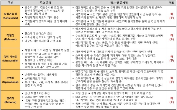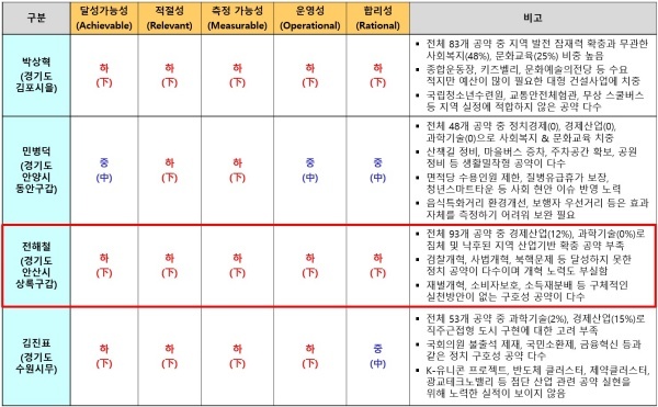 전 의원이 제시한 93개 공약은 △달성가능성 △적절성 △측정가능성 △운영성 △합리성 등 5개 영역 모두 최하인 하(下) 평점을 받았다.