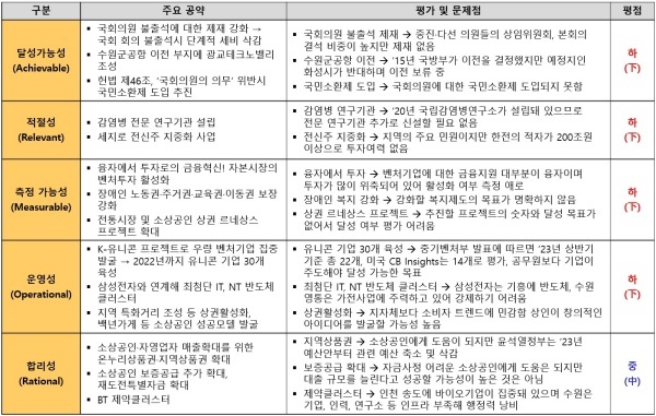 평가방법은 국가정보전략연구소(국정연)가 개발한 ‘오곡(五穀)밸리혁신(5G Valley Innovation)-선거공약(ARMOR)’ 평가 모델을 적용했다.