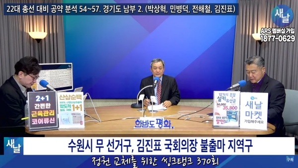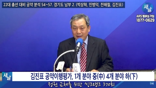 2024년02월20일(화요일) 새날 유튜브 방송은 2020년 21대 국회의원 선거에서 당선된 경기도 수원시무 김진표 의원이 제시한 선거공약을 평가했다. 평가를 위한 방송에는 푸른나무, 이상구 원장, 민진규 소장(국가정보전략연구소)이 출연했다.