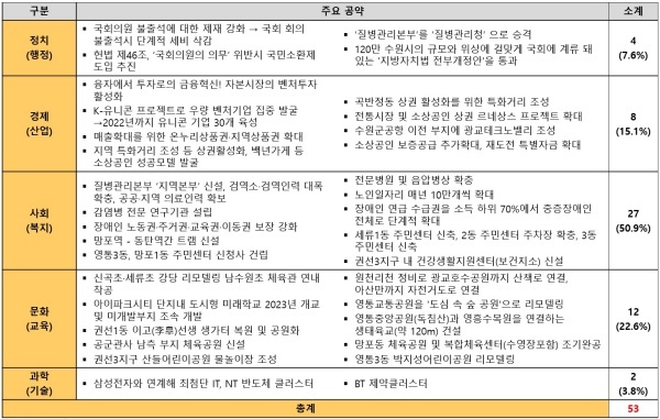 김진표 의원이 21대에 제시한 53개 공약은 정치(행정)(4)·경제(산업)(8)·사회(복지)(27)·문화(교육)(12)·과학(기술)(2) 등으로 구성됐으며 사회(복지) 공약이 전체의 50.9%를 차지했다.