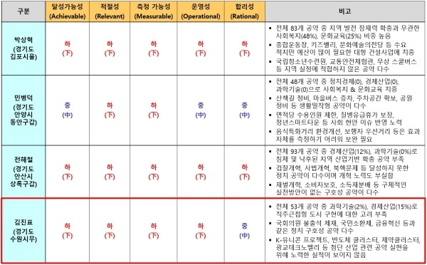 김 의원이 제시한 53개 공약은 △합리성 영역에서 중(中)으로 평가 받았으나 △달성가능성 △적절성 △측정가능성 △운영성 등 4개 영역 모두 최하인 하(下) 평점을 받았다.