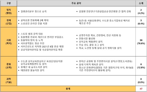 한정애 의원이 21대 제시한 47개 공약은 정치(행정)(2)·경제(산업)(3)·사회(복지)(36)·문화(교육)(6)·과학(기술)(0) 등으로 구성됐으며 사회(복지) 공약이 전체의 76.6%를 차지했다.