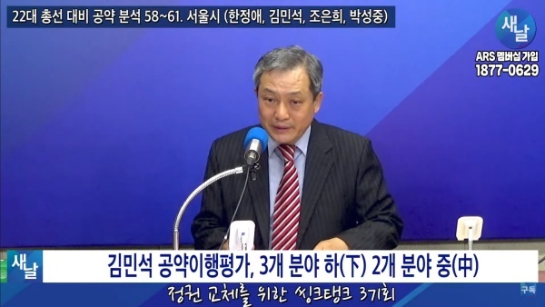 2024년02월27일(화요일) 새날 유튜브 방송은 2020년 21대 국회의원 선거에서 당선된 서울시 영등포구을 김민석 의원이 제시한 선거공약을 평가했다. 평가를 위한 방송에는 푸른나무, 이상구 원장, 민진규 소장(국가정보전략연구소)이 출연했다.