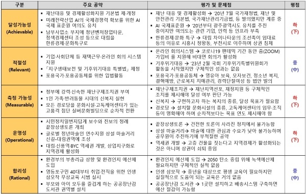 평가방법은 국가정보전략연구소(국정연)가 개발한 ‘오곡(五穀)밸리혁신(5G Valley Innovation)-선거공약(ARMOR)’ 평가 모델을 적용했다.
