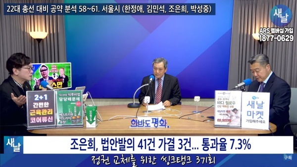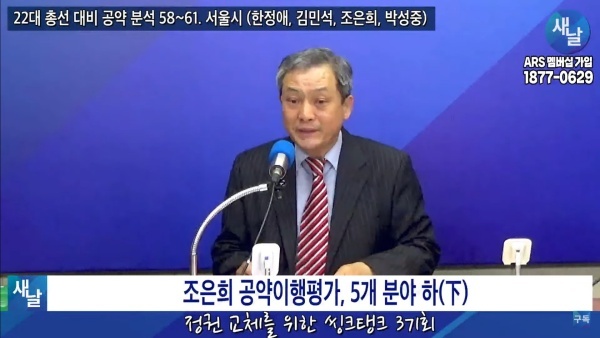 2024년02월27일(화요일) 새날 유튜브 방송은 2020년 21대 국회의원 선거에서 당선된 서울시 서초구갑 조은희 의원이 제시한 선거공약을 평가했다. 평가를 위한 방송에는 푸른나무, 이상구 원장, 민진규 소장(국가정보전략연구소)이 출연했다.