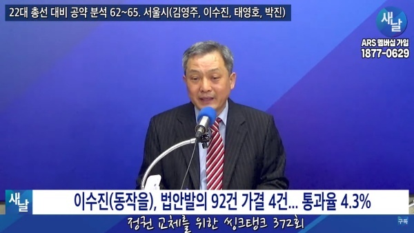 2024년03월05일(화요일) 새날 유튜브 방송은 2020년 21대 국회의원 선거에서 당선된 서울시 동작구을 이수진 의원이 제시한 선거공약을 평가했다. 평가를 위한 방송에는 푸른나무, 이상구 원장, 민진규 소장(국가정보전략연구소)이 출연했다.