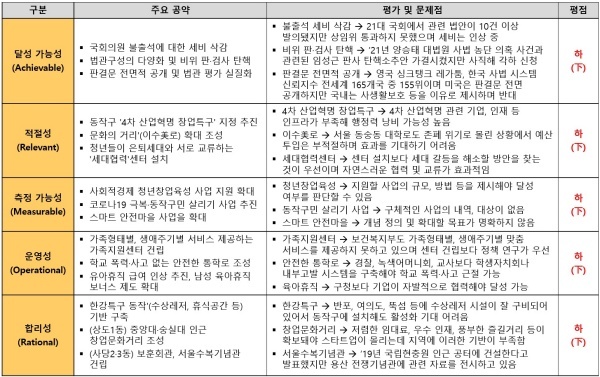 ▲ 서울시 동작구을 이수진 의원 공약 평가 결과(달성가능성/적절성/측정가능성/운영성/합리성) [출처=국가정보전략연구소(iNIS)]