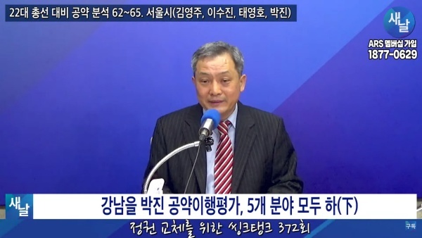 2024년03월05일(화요일) 새날 유튜브 방송은 2020년 21대 국회의원 선거에서 당선된 서울시 강남구을 박진 의원이 제시한 선거공약을 평가했다. 평가를 위한 방송에는 푸른나무, 이상구 원장, 민진규 소장(국가정보전략연구소)이 출연했다.