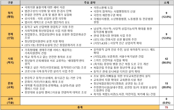 이수진 의원이 21대 제시한 75개 공약은 정치(행정)(9)·경제(산업)(9)·사회(복지)(42)·문화(교육)(15)·과학(기술)(0) 등으로 구성됐으며 사회(복지) 공약이 전체의 56.0%를 차지했다.