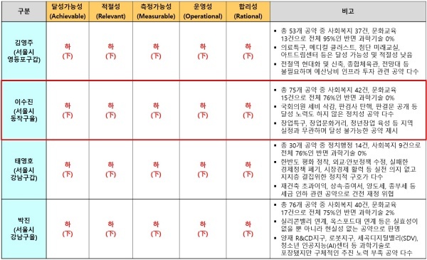 이 의원이 제시한 75개 공약은 △달성가능성 △적절성 △측정가능성 △운영성 △합리성 영역 등 5개 영역 모두 최하인 하(下) 평점을 받았다.