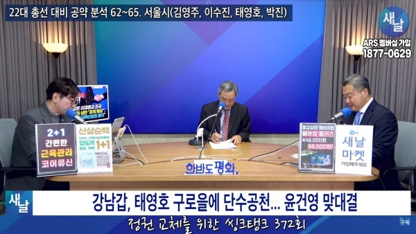 2024년03월05일(화요일) 새날 유튜브 방송은 2020년 21대 국회의원 선거에서 당선된 서울시 강남구갑 태영호 의원이 제시한 선거공약을 평가했다. 평가를 위한 방송에는 푸른나무, 이상구 원장, 민진규 소장(국가정보전략연구소)이 출연했다.
