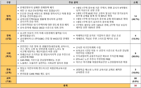 다음으로 △사회(복지) 공약 30.0% △경제(산업) 공약 13.3% △문화(교육) 공약 10.0% △과학(기술) 공약 0.0%를 각각 기록했다.