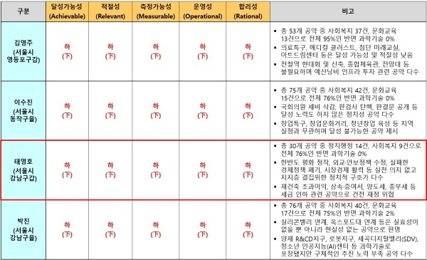 태 의원이 제시한 30개 공약은 △달성가능성 △적절성 △측정가능성 △운영성 △합리성 영역 등 5개 영역 모두 최하인 하(下) 평점을 받았다.