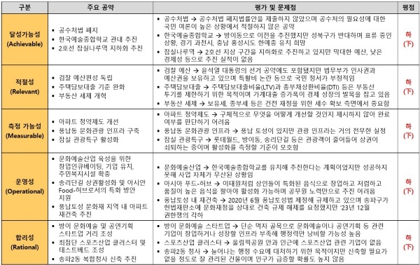 ▲ 서울시 송파구갑 김웅 의원 공약 평가 결과(달성가능성/적절성/측정가능성/운영성/합리성) [출처=국가정보전략연구소(iNIS)]