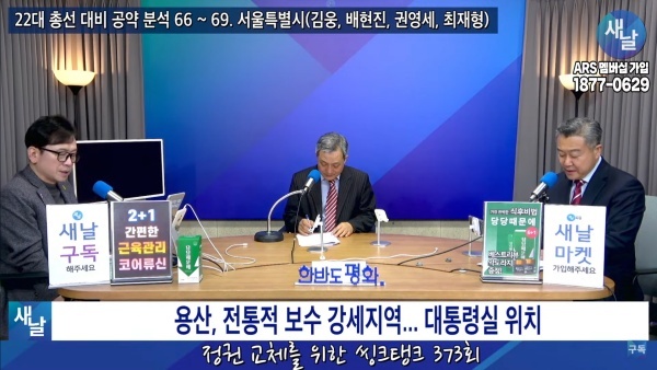 2024년03월12일(화요일) 새날 유튜브 방송은 2020년 21대 국회의원 선거에서 당선된 서울시 용산구 권영세 의원이 제시한 선거공약을 평가했다. 평가를 위한 방송에는 푸른나무, 이상구 원장, 민진규 소장(국가정보전략연구소)이 출연했다.