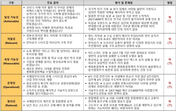 평가방법은 국가정보전략연구소(국정연)가 개발한 ‘오곡(五穀)밸리혁신(5G Valley Innovation)-선거공약(ARMOR)’ 평가 모델을 적용했다.