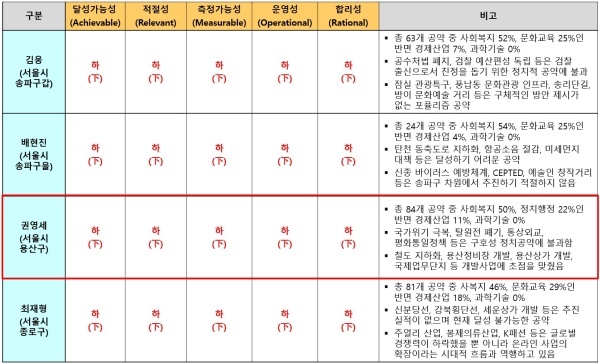권 의원이 제시한 84개 공약은 △달성가능성 △적절성 △측정가능성 △운영성 △합리성 영역 등 5개 영역 모두 최하인 하(下) 평점을 받았다.