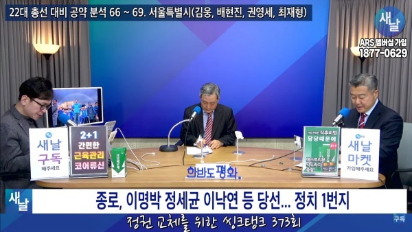 2024년03월12일(화요일) 새날 유튜브 방송은 2020년 21대 국회의원 선거에서 당선된 서울시 종로구 최재영 의원이 제시한 선거공약을 평가했다. 평가를 위한 방송에는 푸른나무, 이상구 원장, 민진규 소장(국가정보전략연구소)이 출연했다.
