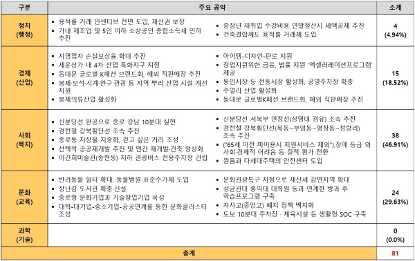 다음으로 △문화(교육) 공약 29.63% △경제(산업) 공약 18.52% △정치(행정) 공약 4.94% △과학(기술) 공약 0.0%를 각각 기록했다.