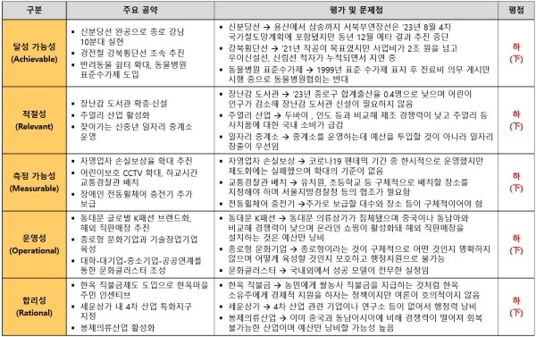 ▲ 서울시 종로구 최재형 의원 공약 평가 결과(달성가능성/적절성/측정가능성/운영성/합리성) [출처=국가정보전략연구소(iNIS)]