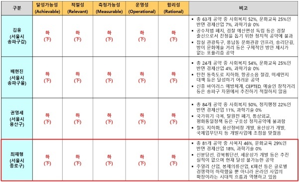 최 의원이 제시한 81개 공약은 △달성가능성 △적절성 △측정가능성 △운영성 △합리성 영역 등 5개 영역 모두 최하인 하(下) 평점을 받았다.
