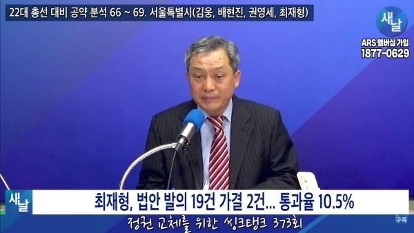 2024년03월12일(화요일) 새날 유튜브 방송은 2020년 21대 국회의원 선거에서 당선된 서울시 종로구 최재영 의원이 제시한 선거공약을 평가했다. 평가를 위한 방송에는 푸른나무, 이상구 원장, 민진규 소장(국가정보전략연구소)이 출연했다.