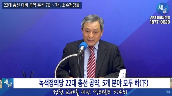 2024년03월26일(화요일) 새날 유튜브 방송은 2024년 22대 국회의원 선거를 위해 녹색정의당이 제시한 선거공약을 평가했다. 평가를 위한 방송에는 푸른나무, 이상구 원장, 민진규 소장(국가정보전략연구소)이 출연했다.