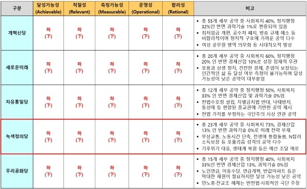녹색정의당이 제시한 12개 공약은 △달성가능성 △적절성 △측정가능성 △운영성 △합리성 영역 등 5개 영역 모두 최하인 하(下) 평점을 받았다.